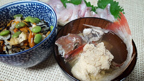 JUGEMテーマ:これ食べた、これ作った 魚市場で金頭を仕入れお刺身と潮汁、ひじきの炊き込みご飯でバランスを整えました。 ワタシタベルヒト。美味しかったです。