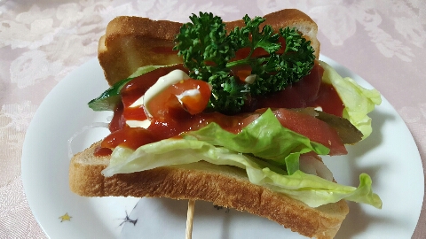 JUGEMテーマ:これ食べた、これ作った パセリを沢山買っておいたら、野菜たっぷりのサンドイッチが出来上がりー! ケチャップ、マスタード、マヨネーズ味のアンサンブルはバッチリ。 ソーセージやピクルスもちゃんと隠れています。 イタダキマース・・・あれ、ケチャップがほっぺたについちゃった。