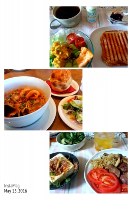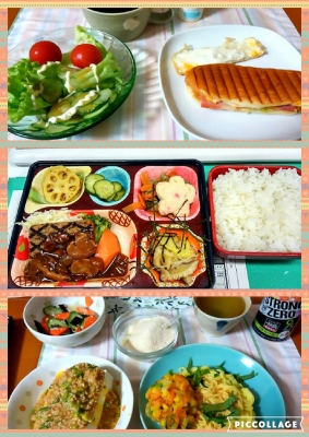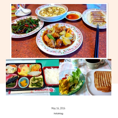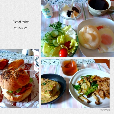 JUGEMテーマ:これ食べた、これ作った 5月16日 朝は全粒粉入り食パンのホットサンド(卵、ベーコンなどをサンド)、カボチャサラダ、ラブレ。 お昼は食堂のヘルシー弁当、595キロカロリー。 オムレツクリームソース、鰆塩焼き、きんぴらごぼう、フレンチサラダ、みかん他、ご飯。 夜は餃子の王将、麻婆豆腐、餃子、チンジャオロース、酢豚を親父とシェア。 オヤツにソフトクリームを食べました。 5月17日 朝は全粒粉入り食パンでホットサンド(卵、ベーコンなどをサンド)、サラダ、ブルーベリージヤムと蓮根パウダ...
