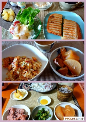 JUGEMテーマ:これ食べた、これ作った 今朝は超熟ロールに夕べ残しておいた鯵のフライをサンドしてパニーニに。サラダ、卵、ラブレ。 お昼はほうれん草入りきつねうどん、カマンベールチーズ。 オヤツに清見オレンジ。 夜は冷凍しておいた自家製ハンバーグでロコモコ風丼、ご飯の間に焼肉タレで味付けしたモヤシを入れた。 柚子大根の漬物。 デザートに蓮根パウダー入り柚子ジャムがけヨーグルトを食べました。