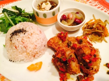 今日は、お店では、特にイベントはなく、 一日通して(11時〜21時まで) 通常営業しています。 日中は、千歳烏山の「コミュニティカフェななつのこ」での 【手づくりようちえんカフェ】に出店もしています。 こちらもどうぞよろしくお願いします〜。 本日のメニューは・・・、 ★本日のOHANAプレート★ * 高野豆腐カツ~自家製デミグラスソース~ * トマトとコーンのマリネ * 南瓜と胡桃のマッシュサラダ * みそ汁、サラダ、お漬物 * 玄米 or 七分つき米(古代米入り) ★本日の100%ベジカレー★ * じ...