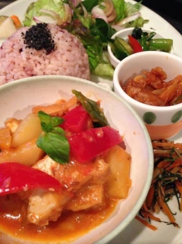 今日は、午前中は、 水野みさをさんの【フラWS】。 内田ボブさんの「ヤポネシアフリーウェイ」を踊ります。 ウォームアップに、ハイチの虹の蛇の踊りを。 本日の一般通常営業は11時45分〜となります。 以降、21時まで、通常営業です。 本日のメニューは・・・、 ★本日のOHANAプレート★ * 彩り野菜と厚揚げのトマトココナッツ煮 * 丘ひじきと根菜の炒め物 * ベジミートの中華餡 * みそ汁、サラダ、お漬物 * 玄米 or 七分つき米(古代米入り) ★本日の100%ベジカレー★ * お豆腐と大根のおうち...
