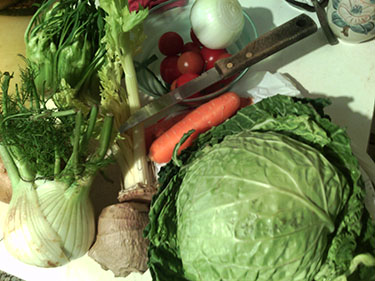 春キャベツ(ヴェルザ)、フィノッキオ、プンタレッレ、セロリ、 人参、玉ねぎ、トマト、色々山盛り使ってストゥファータ (ギュッと蒸し煮:方言ではソフォカータ)を作りました。 無農薬野菜がたんまりとあるので新鮮なうちにたんまり食べる!! 直径30cmの無水鍋に山盛りの野菜を2重蓋にしてギュッと 蒸し煮、塩もE.V.O.OILもアローロも適量入れて放って置くだけ。 野菜からのスープが旨味いっぱいです。 様子見の中間実況。。。色鮮やかなうちはまだ駄目、もっと ベッシャリすると野菜の甘みが増...
