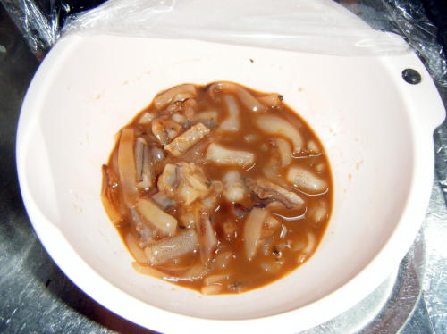 JUGEMテーマ:グルメ JUGEMテーマ:田舎暮らし JUGEMテーマ:食べある記|グルメ JUGEMテーマ:四季折々 JUGEMテーマ:始めよう!自炊生活!! JUGEMテーマ:グルメ JUGEMテーマ:干物 胴体とゲソを干し終わってから、最後に念願の「イカの塩辛」の混ぜ混ぜ工程に移ります。 ボールに塩漬けしといたワタを水で洗って包丁で袋を破って中のワタを取り出します。 で、作り方では包丁で叩くと書いてあったが、ボールにとったので包丁で叩くのは不可能。 なので、自分の手でよく混ぜました。 そして、さっき細かく...