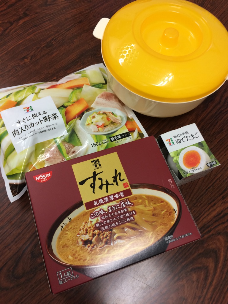 最近これにハマってます 電子レンジだけで 即席袋ラーメンをつくれる器 調理器として ラーメン丼として 一つで二役こなす 優れものです これで既にいくつか 即席袋ラーメンを作って 喰してみましたが とても便利です! ラ王、うまかっちゃん、など ノンフライ麺でも油麺でも お鍋で作るのと いたって変わりません この器の良いところは なんと言っても 調理が楽 後片付けも楽 セブンイレブンで具材を調達の図 麺とスープ 冷凍カット野菜 ゆで卵(味付け) そして電子レンジ調理用器 ...