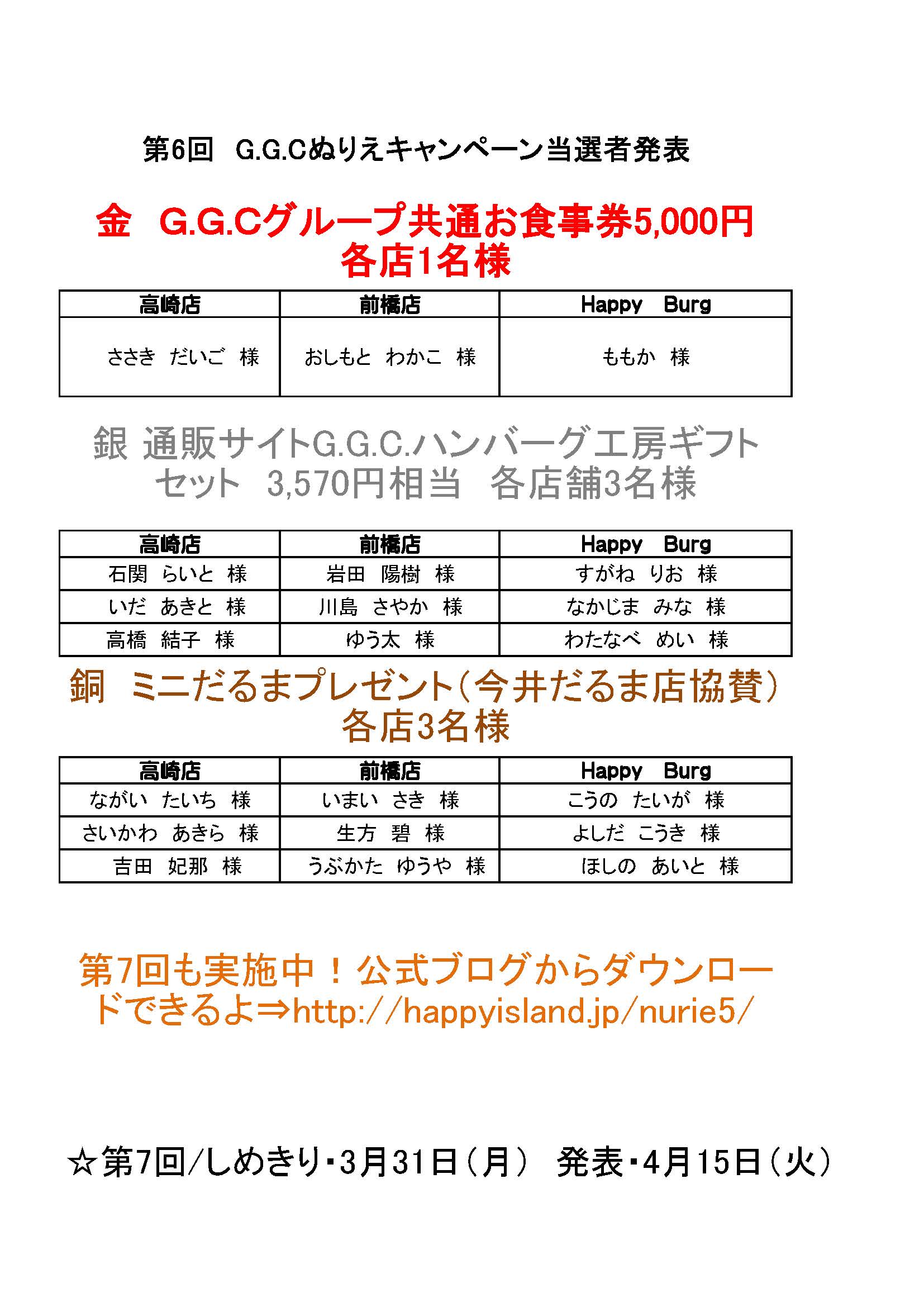 第5回 GGCぬりえキャンペーン当選者発表! たくさんのご応募、ありがとうございました(^◇^) 当選者の方には商品を随時発送させていだきます♪ 詳しくはブログをみてね!(^^)! JUGEMテーマ:お知らせ JUGEMテーマ:GGC ハンバーグ ステーキ JUGEMテーマ:地域/ローカル JUGEMテーマ:群馬の情報もりだくさん!!伊勢崎・太田・高崎・前橋 JUGEMテーマ:群馬 伊勢崎・高崎・太田・前橋のグルメ店・居酒屋・宴会