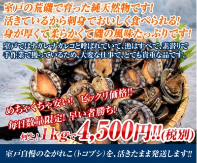 JUGEMテーマ:おとりよせ 店長の松澤です。 毎年お待ちになっている皆様!お待たせいたしました!! 今年も4月に入り、小さなアワビといわれる「ながれこ(トコブシ)」の漁が始まりました。 早速、販売を開始いたします!! ※天然のモノを活きたままお送りするため、天候や漁の様子に左右され、早々に売り切れになる場合もございますのでご了承ください。 販売ページはコチラです。 http://murototsuhan.com/?pid=53778887 &nb...
