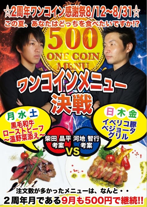JUGEMテーマ:レストラン こんにちは Meguです 8月12日から31日までやっていた 2周年ワンコイン感謝祭 ローストビーフVSイベリコ豚ベジョータグリル 結果発表をしますっっっっ ローストビーフ74食 ...