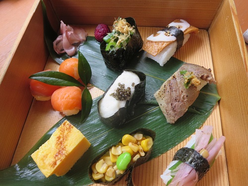 箱根湯本温泉 天山湯治郷に来ました。待ち焦がれてた、「山のにぎり」。 ここに来ると必ずオーダーします。 猪肉ローストにぎり、大和芋の軍艦巻、マスの手毬寿司、茗荷のにぎり、とうもろこしの軍艦巻、蓮根稲荷、オクラとモロヘイヤの軍艦巻、ガリ、玉子焼、山もも 色合いから、旬の素材から、サイズ感から、食べてもおいしい、見ても楽しい… 大好きな山のにぎり… 猪肉のロースト… クセもなく、とても美味しい! 鱒の手毬寿司… キレイ… 食べるのもったいないほど… じゅん菜とたこの酢の物 川エビの唐揚 ビ...