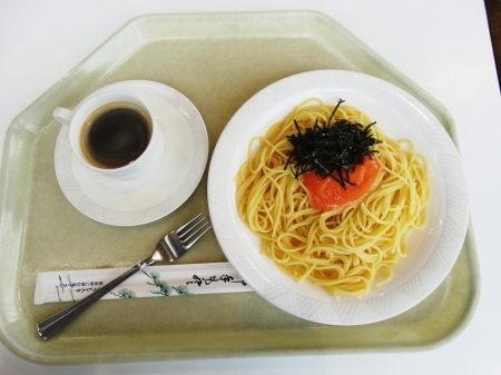 JUGEMテーマ:美味しく愉しく外ご飯 明太子スパゲティー!! なのでございます。 「パスタ」と言わないところが、「レストラン」ではなくて「カフェテリア」のレベル。 かなぁ?と、妄想するのでありますけれども。 このメニュー。 あくまでも「単品」なのでありまして、「コーヒー」のほうは別料金。 合算で、税込み850円なのでございます。 ただ、コーヒーのほうには「SET」と打たれておりましたので、「スパゲティー」と一緒に注文すると割引になっている?のかもしれま...