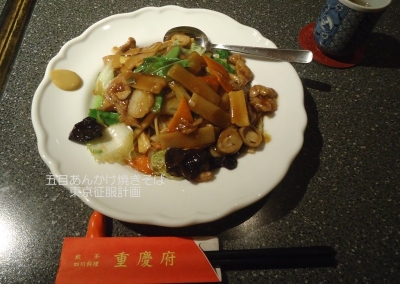 新橋 「四川料理 重慶府」 五目焼きそば ディナー 1,080円 (ランチ 900円) 具 豚肉・白菜・チンゲン菜・たけのこ・ヤングコーン・さやえんどう・くわい・フクロタケ・キクラゲ・にんじん 麺 太さ普通 焦げ目なし モチモチした麺 胡椒しっかりめのやや濃いめ味で、油っこさも少しあり、味は普通でした。 << 焼きそばメニュー >> 黒酢焼きそば 焼きビーフン 麻辣ビーフン ...