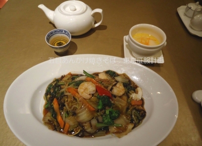 カレッタ汐留 「精作名菜軒 湘坊 SHAN FANG」 シャンファン 五目ヤキソバ ランチセット 今週のスープ付き 1,390円 (税込) 具 えび2尾・いか1・ホタテ(カット)・はまぐり2・豚肉・白菜・ブロッコリー・青菜・細切りキクラゲ・パプリカ・にんじん 麺 やや細め 焦げ目・パリパリ部分あり 餡は甘め、エビはプリプリでイカは柔らかく、はまぐりはいまいち。 麺の固い部分がパリっとしていなく固...
