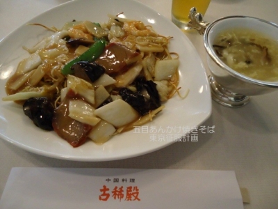 グランドプリンスホテル新高輪 「古稀殿」 こきでん 五目焼きそば 1,800円 (税込・サービス料10%別) 具 えび2尾・いか3・チャーシュー3・鶏肉・白菜・たけのこ・キクラゲ・しいたけ・さやえんどう 麺 細め 焦げ目あり 油っこさなし。味は濃くも薄くもないが、ややあっさりめ。餡は少なめでした。 海老は大きく質まぁまぁ、イカは少し固め。 スープは、豆腐・卵・きくらげ・鶏肉入りでとろみが強い。 ...