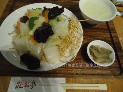 神楽坂 「龍公亭」 りゅうこうてい 創業明治22年の、広東料理の老舗中華料理店です。 五目入り焼きそば ランチ 1,300円 (スープ・ザーサイ・中国茶付き) 具 えび2尾・いか3・たけのこ・白菜・ピーマン・きくらげ・しいたけ など 麺 太さ普通 焦げ目少し パリパリ部分あり 塩味で、海老プリプリ、イカは大きめでまぁまぁ柔らかく、味は薄めであっさりしていました。 ☆ その他の焼きそばメニュー ☆ ランチ 高菜と豚肉の細切り焼きそば 1,000円 海鮮入り焼きそ...