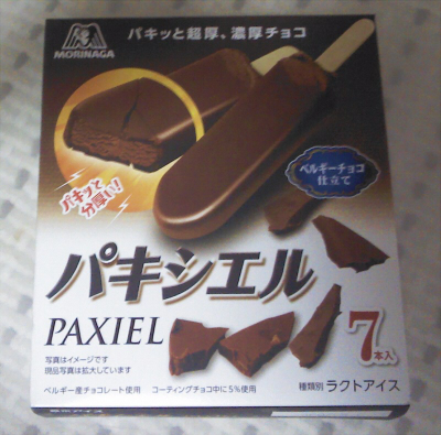 JUGEMテーマ:アイス 森永製菓 パキシエル 森永 バキシエル マルチ 9入 おいしいですよ!でも通販ではほとんど扱われてないみたいですね。 ベルギーチョコ仕立て パキッと超厚、濃厚チョコ<パキシエル> まるで板チョコのような分厚く・パキッとした歯ごたえ。 ベルギー産チョコレートを使った本格的な味わい・・・ それは、あなたのための 秘密のご褒美。 ここから開けると… 何かかわいいのが。 中袋は上品なデザイン。 小さめです。 パキパキ感がいい! 外は甘...