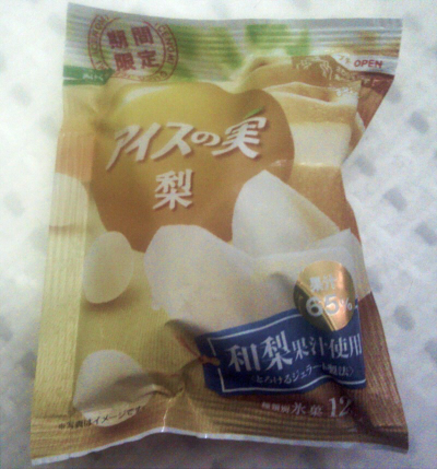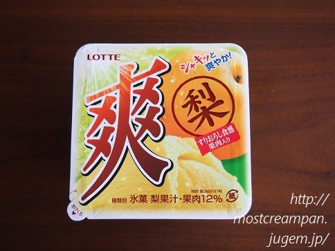 久しぶりにアイスネタ。 LOTTEの「爽 梨」です。左上のピカーンと光るパッケージが・・・w 梨味と言えばガリガリ君を思い出すのですが、溶けるのが早かったイメージ。 そしてこれも早い! 最初は甘い!と思ったけど、梨の爽やかな感じがベタベタせず、 なめらか〜んな口溶けです。 「すりおろし食感果肉入り」とかかれていますが 確かに途中で果肉の粒々も感じられますよ♪ 横のパッケージ。こういう感じ好きですw