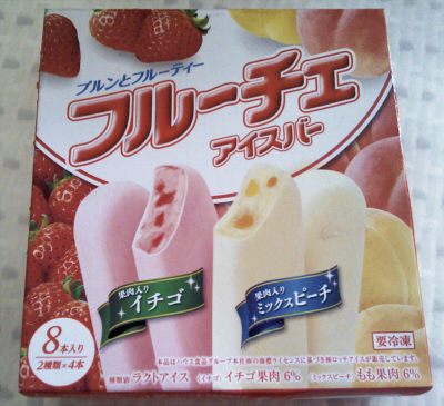 JUGEMテーマ:アイス プルンとフルーティー フルーチェアイスバー フルーチェはハウス食品だと知ってたので、何の疑いもなく買ったら これロッテだった…。ひっそりすぎるよ…どうやらコラボみたいですね。 何だかえらくひっそりしたコラボですよね。 まずはミックスピーチアイス。 具もそれなりに。味もそれなりにフルーチェ…かな? 柔らかい甘みです。食感も柔らかめかと思います。 果肉のぷるんとした感じはやはり本家のぷるぷるに軍配が上がります! ...