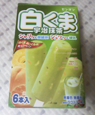JUGEMテーマ:アイス センタン 白くま 宇治抹茶 ↑リンク先、行ってみてください。ちょっと楽しい。 3Dでパッケージが見られます。凝ってますね。 シャリっと微細氷 ジュワッと練乳 パイン・みかんさのう・小豆・微細氷いり抹茶アイス・黄桃 結構たくさんの具が入っているのです。 ※ みかんさのう :いわゆるつぶつぶですね。勉強になった。 微細氷が入っているため、結構崩れるように溶けやすい印象です。 シャリシャリあっさりでくちどけの良い抹茶アイスに 甘いあずきと果物が隠れています...
