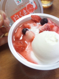 アイス部分は練乳みたいなまろやかな甘さ♡大きなスライスイチゴとスライスメロンが目を引きますが、他にもカットイチゴがゴロゴロ入っています!ただ…スライスイチゴを口に入れると、花火の煙みたいな味(???)が…(´⊙▿⊙`)