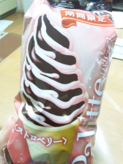 パリッテのいちご味でたー!名前のとおり薄く入っているチョコがパリパリでうまー!アイスはホイップしたものを固めたようなちょいふわ食感!よくあるいちご味〜
