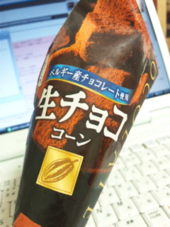 私の愛する生チョコもなかの仲間!コーン版です!…が、開けるのに失敗してコーンを境に上下に割れたので味わっている暇がなかった… チョコ感は相変わらず濃厚!だけどコーンの内側にチョココーティングなどがなく、コーンがしなしなしてた…