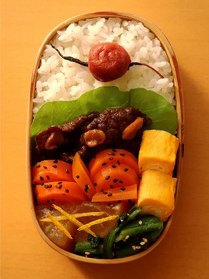 本日の弁当: 牛しぐれ煮 → 大根の柚子煮 → 人参の甘煮 → ほうれん草おひたし 玉子焼き ルッコラ 梅干 白米ごはん 【大根の柚子煮】 つくりかたは、こちら→ 師走ですな。先々週、散髪帰り際に髪切りの お兄さんから「よいお年を」と言われ、あー もうそんな季節なのねとうっかり気付く。 今年は忘年会無いし、幸いシゴトはあるけど 例年よりは薄いし、いまいち師走感ないわー。 せめて柚子の香りする大根を煮...