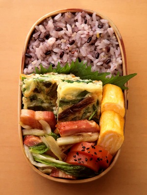 本日の弁当: 分葱(わけぎ)のチヂミ ウルイとベーコン炒め → 人参の甘煮 → 玉子焼き 大葉 五穀米ごはん 【分葱(わけぎ)のチヂミ】 1)分葱は2〜3cmにカット、球根 部分は薄切りに、彩り担当の人参も 分葱と同じ大きさにカットする。 2)ボウルに小麦粉・片栗粉・顆粒 の鶏がらスープの素、更に水と卵を 加えダマにならないよう溶き混ぜた あと、上記1の材料を混ぜ合わせる。 ※分葱150gに対して、小麦粉90g、 片...