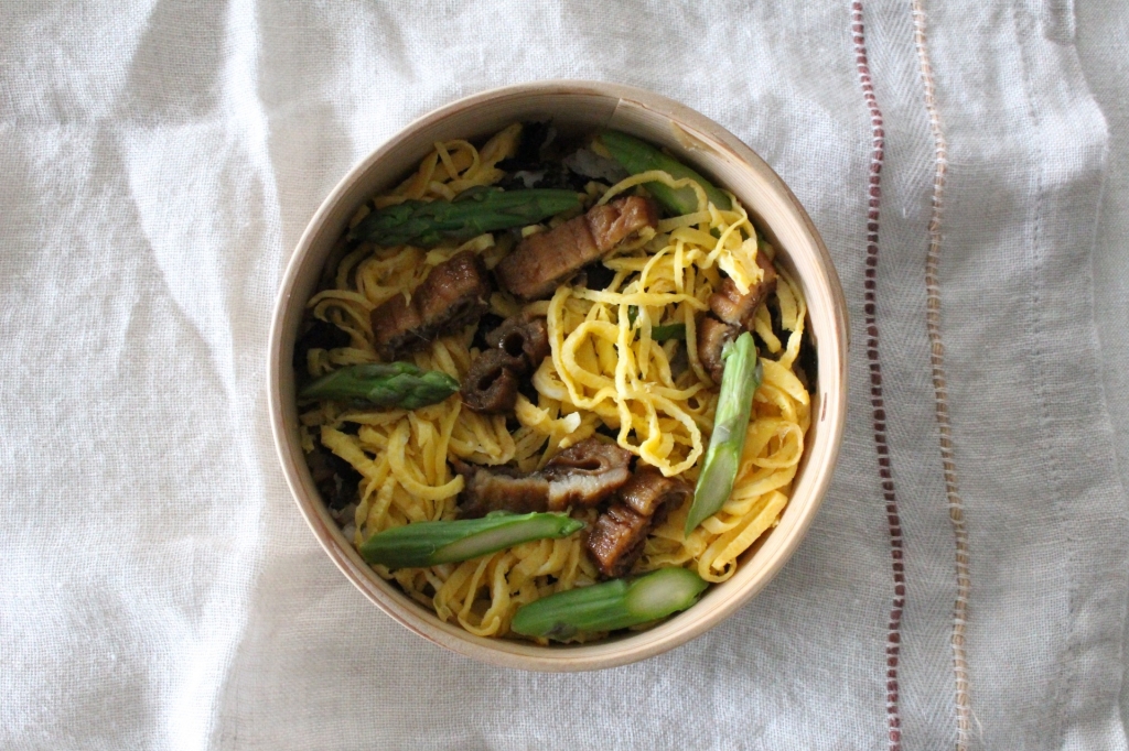 JUGEMテーマ:お弁当写真 今日のお弁当 散らし寿司 昨夜 お祭りから帰って穴子を炊きました。今朝は眠くてねむくて。。秋風に夏の疲れが出たようです 大好きな穴子 味付けが濃くなりすぎたんだけれど やっぱり美味しいです・・明日は穴子丼にして食べようと思ってます。 煮穴子は土鍋に数カ所穴を開けたクッキングシートを敷きその上に穴子を並べ 同量のお酒とお水で20分くらい弱火でトロトロと炊き 砂糖を入れて15分くらい醤油を入れて20分〜 好みの柔らかさになるまで炊きます。。 トロト...