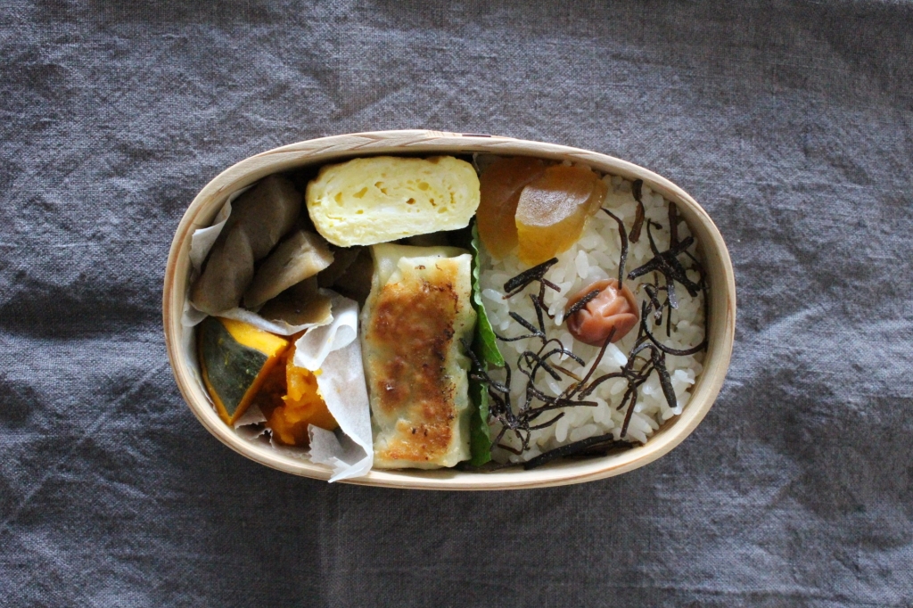 JUGEMテーマ:お弁当写真 餃子弁当 ニラ焼き餃子 卵焼き 坊ちゃんカボチャの甘煮 牛蒡とコンニャクの煮物 ごはん 白梅 ウリの粕漬け 小松こんぶ 。。。 今日はお友達からいただいた 白梅とウリの粕漬け入りのお弁当です。。 おにぎり弁当も好きなんだけど わっぱに入れると白いご飯だけでも美味しいですよ。餃子はお弁当に入れるため濃いめに味付けをして四角に包んで両面焼いています にほんブログ村 人気ブログランキング