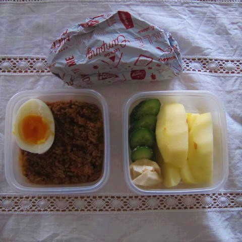 今日のお弁当は合い挽き肉のキーマカレー。 レシピは印度カリー子さんのラムキーマカレーのレシピを参考に。 付け合せにりんごとぬか漬け(胡瓜と長芋)、塩バターフランスパン。 カレーとゆで卵は前日の作り置き。 朝はりんごとぬか漬けを切るだけなので、すごく楽。 りんごは塩水に10分くらい漬けておいて変色防止。 ぬか漬けは周りのぬかを残したままのほうが時間を置いてもおいしいのだそう。 パンは本当はライ麦パンを買うつもりだったのだけど、スーパーの中にあった ドイツパ...