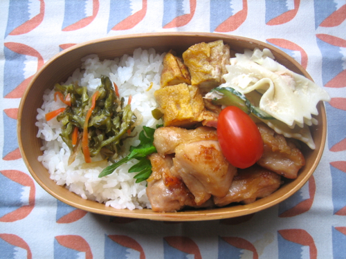 1/9(火) ・鶏の照焼き ・リボンパスタのツナマヨサラダ ・ソーセージ入り卵焼きとトマト ・ごはんとぜんご漬け(主人はのり弁) ・写ってないけど豆腐とネギの味噌汁 東京くもり。写真泣かせの天気なり。 明けました。おめでとうございました。 今日からお仕事スタート+久びさ弁当。 ということで鶏の照焼。 リボンパスタのツナマヨサラダは昨晩作ったもの。 ソーセージ入り卵焼きは、主人がつまみで食べなかったソーセージを入れたもの。 でも弁当はそれなりに出来たの(人´...