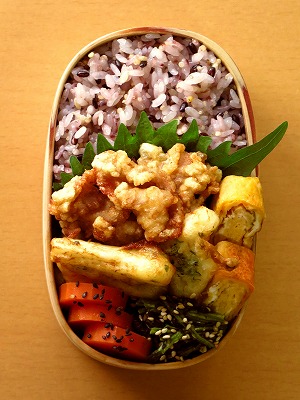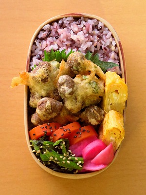 本日の弁当: むかごととろろの親子揚げ → ほうれん草おひたし かぶの梅酢漬け 人参の甘煮 → 玉子焼き 大葉 五穀米ごはん 【むかごととろろの親子揚げ】 つくりかたは、こちら→ むかごは友人からのクリスマス プレゼントだ、シブい(^^;)。 十月に「最近スーパーで売って ないんだよねえ」と言った私の 一言を覚えていてくれたそうな。 うへい、ありがたいねえ。 -- これが私の弁当納め。変り映え しない常備菜多用の弁当...