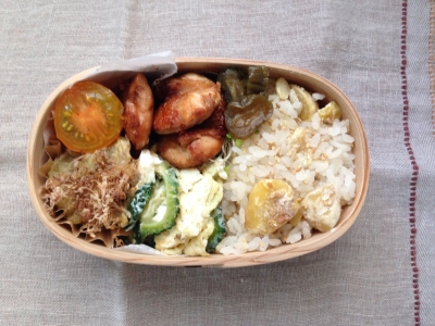 JUGEMテーマ:お弁当写真 今日のお弁当 栗ご飯 鳥の照り焼き 焼き茄子 ゴーヤの卵とじ プチトマト ブロッコリースーパースプラウト 胡瓜の粕漬け 。。。。。。。。。 もう秋ですね。。昨日市場で栗を見つけたので栗ご飯を炊きました。。今年の夏はあまり焼き茄子を食べなかったと思って焼き茄子を作ったり。。。夏にもう少し食べたかったと思うものと秋のものを食べてるので少し太ってしまいました。 にほんブログ村 人気ブログランキング