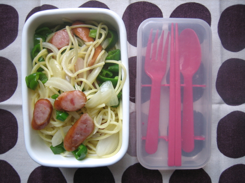 ・ソーセージとピーマンと玉ねぎのパスタ弁当 以上! 東京くもり。 涼しくて気持ちがよい朝です。 休日なので静かな朝です。 あぁよく眠れそうな朝なのに… 今日はパスタ弁(-_-;)。 弁当作るきなかったんだけど、 いや、上手くいけば休むつもりだったんだけど… 昨日終了10分前に「土曜日までお願いします」と仕事が舞い込みました(´;ω;`)ブワッ。 しょうがないよね、来週一週間休むんだもん、しょうがないよね(´;ω;`)ブワッ。 ちゃ...