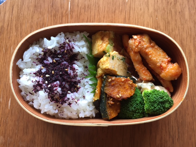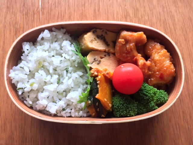 きょうのお弁当はこちら・・・ ・鶏ムネ肉のチリソース ・塩昆布入り卵焼き ・かぼちゃのゴマ照り焼き ・ゆでブロッコリー ・ミニトマト ・青菜ごはん JUGEMテーマ:お弁当写真