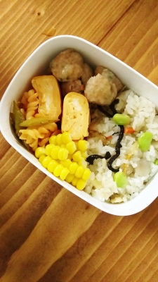 JUGEMテーマ:お弁当写真 今日は 息子の月一お弁当の日でした 若干 朝からバタバタしながら 袋に詰め込んで 今日のお弁当は ・ごぼうとホタテのおこわ ・玉子焼き ・インゲンとキャベツショートパスタのナポリタン ・ピーマンと人参いり肉団子 ・とうもろこし 粒々だけ でした 帰宅して 開けてみるときれいに 食べられていて ハハはニヤリ 嬉しい限りです お昼ごはんは いったいどんな顔して 食べてるんだろう? とにかく お昼ごはんは よく食べるみたいなので きっと 一心不乱に...