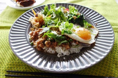 本日のランチは、冷蔵庫にパクチー(香菜)があったので ガパオライスにすることに・・・ 鶏のひき肉とバジル/or パクチー、ニンニク、玉ねぎ、 赤パプリカを炒めてオイスターソース、豆板醤、ナンプラー、 砂糖でちょちょいと味付けして、ご飯の上に掛けて フライドエッグとパクチーをトッピングすれば出来上がりっ! あとは、ほうれん草のナムルと干し大根のサラダを添えて。 黄身と混ぜて食べると辛みがまろやかになって丁度イイ感じに なります:-) 食後の...