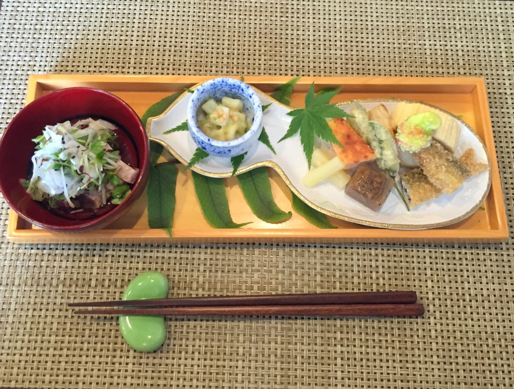 JUGEMテーマ:今日のランチは..... 皐月茶会の後 日本料理あおいでランチをいただきました。 これはお弁当です。ランチ価格は1940円だったかな? 左は葉ガツオのたたきです どれも繊細なお品です ソラマメ、お茶の葉の天ぷらもありました。 筍饅頭の海苔あんかけ これはおいしい!! ジャコごはんにお吸い物と香の物 ...