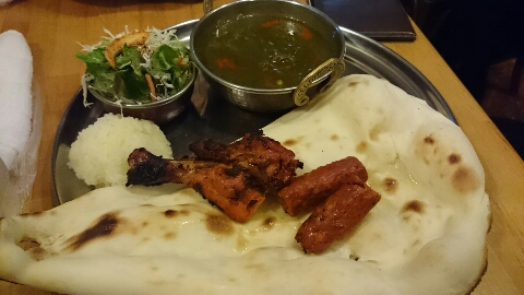 JUGEMテーマ:今日のランチは..... 久々に来ました!ガンディーマハル。 今回もランチパスポートですが、前回のワンコインではなくワンシート?1,000円メニューです。 サラダ、カレー、ナン、サフランライス、タンドリーチキン、シークカバブと贅沢メニュー。 カレーの辛さが1〜5辛まで選べます。 私はもっとも辛い5辛で。 ここのお店は、そこまで辛くならないので5辛でも全然いけます。 カレーはめちゃくちゃ美味しくて、ナンは個人的にはもう少しぱりぱりっとしているほうが好みですね。 こちらはふっくら系です。で...