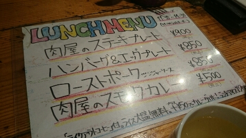 JUGEMテーマ:今日のランチは..... 今日は、行列でいつも入れない東京ブッチャーズへ。 久しぶりのステーキプレート、今日はカレー掛けせずに標準料金(笑) ローストポーク食べたかったんだけど、数日前にトンテキ食べたから辞退。 メニュー盗撮。 スモークカレー以外はすべて体感済み。 私的順位は ローストポーク → ステーキ → ハンバーグ かな。 なぜポーク1位かというと、ポークの付け合せがトウモロコシだから。 ステーキプレート 950円。 牛肉に加えて、チキンもついてきます。 ポテトフライ...