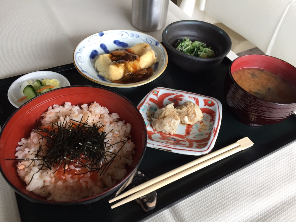 T・A・M・A 青山 / 秋鮭とイクラ御飯 900円 味噌汁・揚げ出汁豆腐・油揚げと水菜の煮浸し・シュウマイ・漬け物のランチセットです。 ランチメニューはいずれも御飯の大盛りが無料となっています。 秋鮭とイクラ御飯は、ほぐしたシャケを酢飯で混ぜて塩漬けイクラと海苔をまぶしたものです。 お店としての味の個性はあまりありませんが、それが逆に家庭的な味付けに感じられるので、食べていてなんだかほっとします。 店内は広々としていて、パーティースペースにも使われたりするそうですよ。