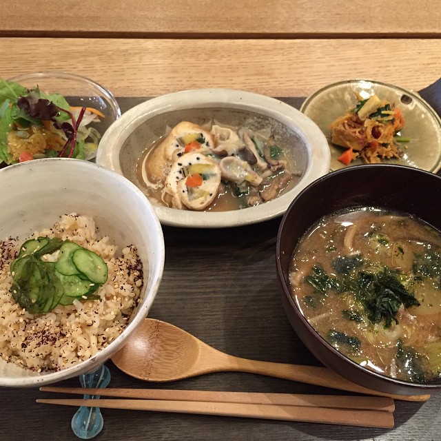たっぷり味噌汁と土鍋ごはん 1,080円 旬の野菜やきのこから出汁をとって煮込まれたと言う味噌汁がとても美味しいです。大きくカットされた野菜がゴロゴロと入っています。ミョウガが味のアクセントになってます。 ご飯は新潟産コシヒカリの玄米ごはん。玄米なのに柔らかいのは土鍋で炊くからだそう。 煮物は生姜の香りを生かしていて、食べると後からピリリッと生姜の辛味が感じられます。 全体的に薄味だけど、素材の風味を生かした身体に優しいオーガニックランチです。