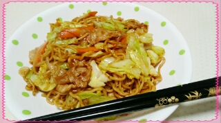 JUGEMテーマ:おうちでランチ♪ 今日のランチは、おうちで焼きそば。 冷蔵庫にある残り野菜と余ってたお肉、 そして3玉100円で購入した焼きそばの麺で 安上がりランチを作って食べました☆ 目玉焼きをのっけよう!なんて思ってたのに、 焼きそばをお皿に盛ってうっかりそのまま フライパンを洗ってしまった・・・ので目玉焼きなし。 ごちそうさまでした! おうちごはんランキングへ