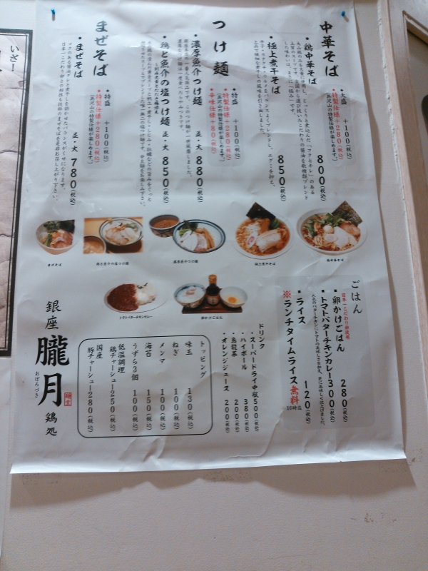 JUGEMテーマ:中華・ラーメンが好き!!! 今回は立川駅のグランデュオ7Fにある 銀座 朧月 に行ってきました 以前より行こう行こうと思いつつ、駅ナカには縁が無いので配達中だとまず足が向かない 休日に行く気にもなれず、日々お客さんトコでの食事もあるので思い立ってから半年以上経って訪店 開店10分前に着く メニュー ランチセット 今回は 鶏中華そばを食べると決めていたのでオーダー 最初のロッドでの提供だったので数...