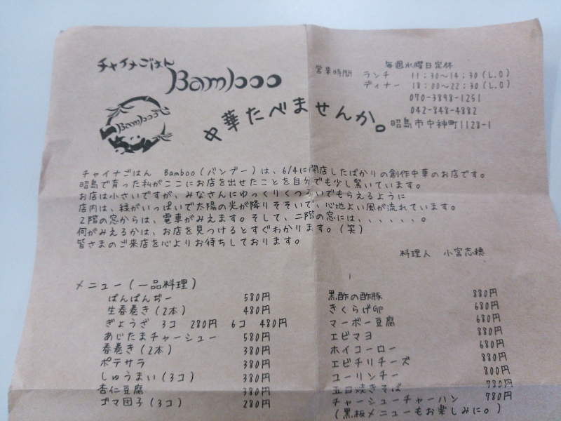 JUGEMテーマ:中華・ラーメンが好き!!! 今回ご紹介するのは JR青梅線の昭島駅と中神駅の中間にある チャイナごはんBumboo ♪ 店舗の場所について 以前の日記1 ・ 以前の日記2 を ご覧下さい まずは外観から 店内の様子 お水はセルフです カウンターの様子 小さい壺の中には高菜が入っており、自由に取る事ができます♪ お箸は1膳づつ箸袋に入っており衛生的ですね♪ メニュー ラ...