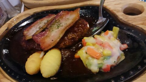 JUGEMテーマ:ハンバーグ 先週子供とびっくりドンキーに 行ってきました。 お目当ては今、CMでやっている ベーコン&本格デミハンバーグ。 ベーコンが分厚い! デミソースが濃厚で 美味しいです(゜∀゜) テレビで作り方を やっていて、隠し味に 赤味噌がはいっているとか・・・ オリジナルのレシピなんでしょうな。 それから、 はじめてイカゲソを 注文してみました。 揚げたてでとっても 美味! ドンキーのサイドメニュー、 ほぼ試しましたが、 どれも美味しいですね。 後はイカ...
