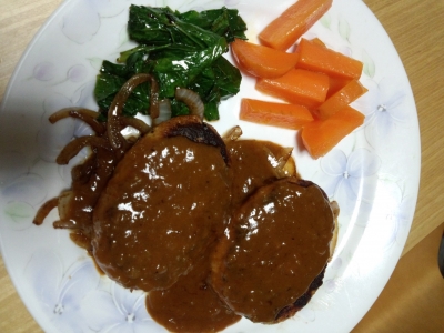 JUGEMテーマ:ハンバーグ先日、かつ雅に行ったとき、レジのところにお持ち帰り用ハンバーグがあると書いてあったので、お持ち帰りしてみました。ハンバーグ(100g)にソース付きで1個150円でした。とんかつ屋さんのハンバーグなので、ポーク100%のようです(^o^)お店の人に作り方を聞きました。生のハンバーグを冷凍してあったので、レンジで30秒ほど解凍し、フライパンで焼きました。焼いた後に付いていたデミグラスソースをフライパンに入れて温めました。 にんじんのグラッセと、タマネギ、青菜炒めは家で作りました。...