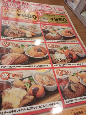 JUGEMテーマ:ハンバーグ今週の月曜日、Big Boyでランチを食べました。お昼が午後2時過ぎと遅くなったので午後5時までランチをやっているBig Boyは助かります。久しぶりに行ったらランチメニューが変わっていました。日替わりグリルランチ、日替わりプレートランチ、あとはハンバーグや大俵ハンバーグなどの3種類です。こちらは今までの日替わりランチとほぼ同じですが、ハンバーグとチキンステーキの量が1.5倍になってお値段も少し上がっていました。日替わりプレートランチは新しくできたみたいです。こんなに種...