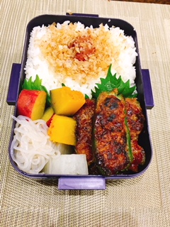 JUGEMテーマ:男子中学生弁当 今日で11月も終わりですね。 明日はもう12月、街の中は益々クリスマスソングでいっぱいなんだろうなぁ。 なんだか気ぜわしい毎日になりそうです。 今日の店番さんは月末なのでお店の掃除をしております。 あちこち掃除機で吸いまくり雑巾がけでピカピカに! きもちだきもちだけ、、、(;^_^A 今日のお弁当の煮物はさつまいもとカボチャの梅酒煮。 昨日の夜に慌てて煮たのでちょっと硬かったです。 慌てずゆっくりコトコトと!ですね(^^♪ ハンバーグの種でピーマンの...