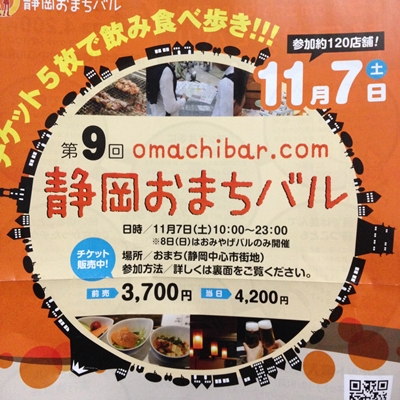 JUGEMテーマ:居酒屋 ”飽きっぽい”と言われる静岡人だが、先日の「大道芸ワールドカップ」は今年で第24回を迎えた。 そして、「静岡おまちバル」も今年第9回を迎えた。裏を返せば「飽きっぽい」と言われる静岡で長続きするものはなかなか良いものということだ。 前売りを買えば3700円で5枚つづりのチケットが買える。そして、約120件の参加店から自由に好きな店を選んでチケットがつかえるという楽しいイベント。おつまみとドリンクというメニューの店が多いが、お持ち帰りやマッサージもあり、バラエティに...